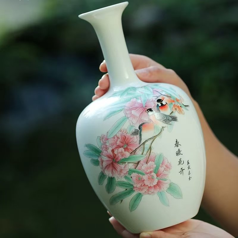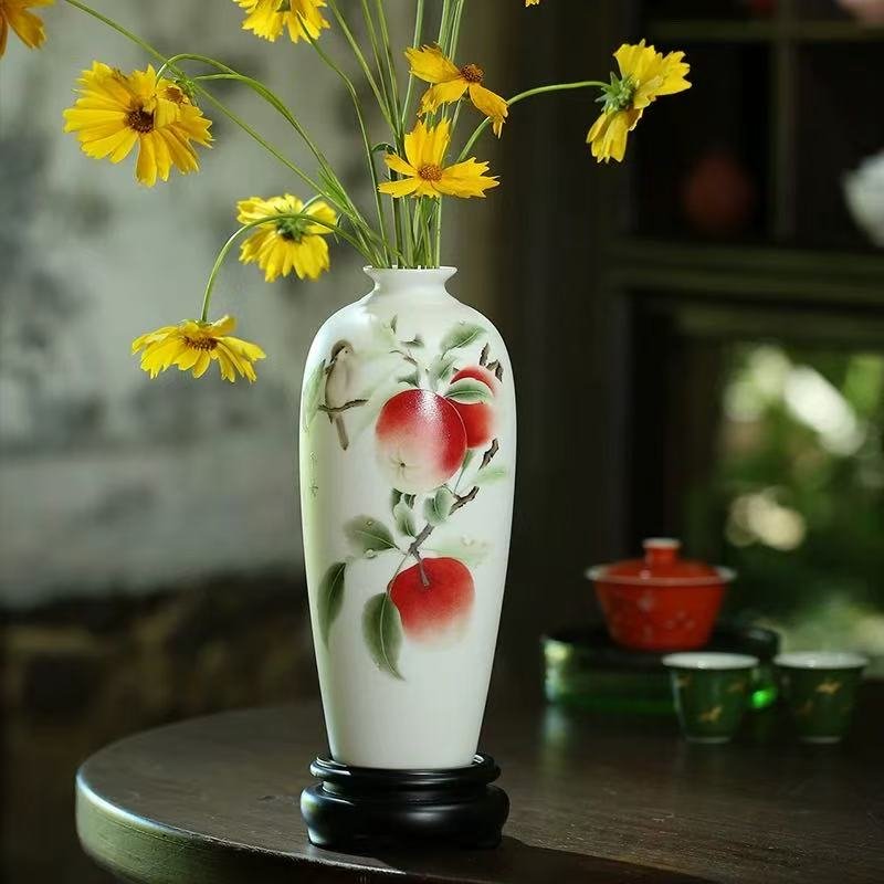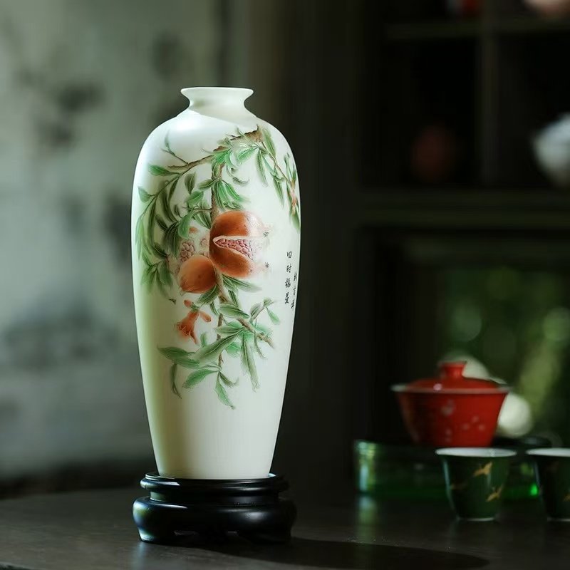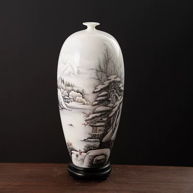 - Thrown and high-fired in fine Blanc de Chine, this vase features a hand-painted landscape where misty peaks and flowing brushwork create a contemplative scene. Calligraphy echoes the painting, bringing together art and vessel. Whether styled on a console or alcove, it elevates the space with refined cultural charm—also ideal for housewarming or corporate gifting.