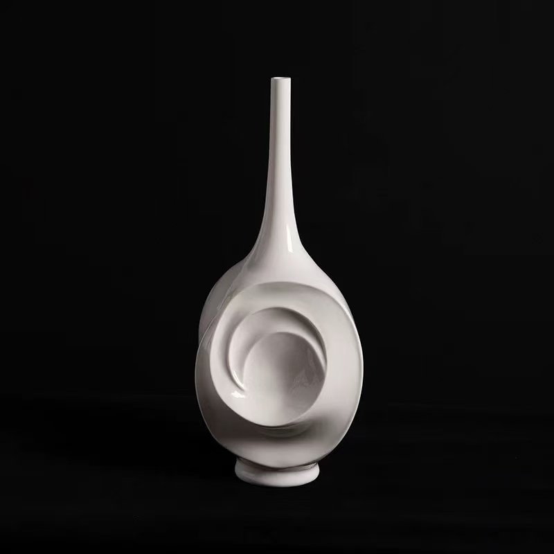 - A minimalist, Japanese-inspired Dehua porcelain vase with a flattened moon form and slender neck. Hand-painted lotus, seedpods, and goldfish—plus subtle relief details—give the ivory glaze a lifelike, tactile depth. Ideal for single-stem ikebana or as a sculptural decor piece, balancing Eastern elegance with modern simplicity.