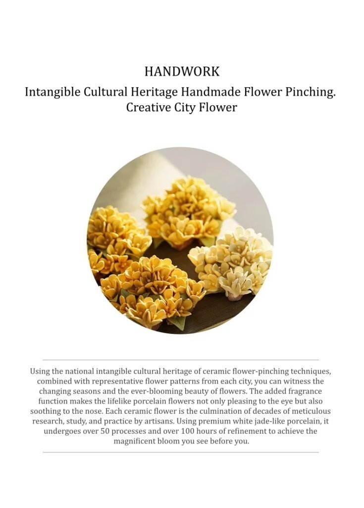 Using the national intangible cultural heritage of ceramic flower-pinching techniques, combined with representative flower patterns from each city, you can witness the changing seasons and the ever-blooming beauty of flowers. The added fragrance function makes the lifelike porcelain flowers not only pleasing to the eye but also soothing to the nose. Each ceramic flower is the culmination of decades of meticulous research, study, and practice by artisans. Using premium white jade-like porcelain, it undergoes over 50 processes and over 100 hours of refinement to achieve the magnificent bloom you see before you.